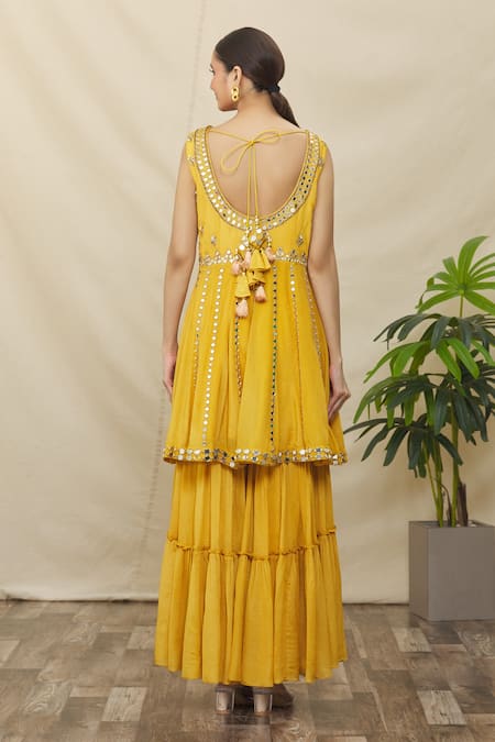 Yellow peplum kurta featuring deep round neck and mirror & cut dana embroidery. Paired with a tiered gharara and net dupatta with embroidered cut work border.